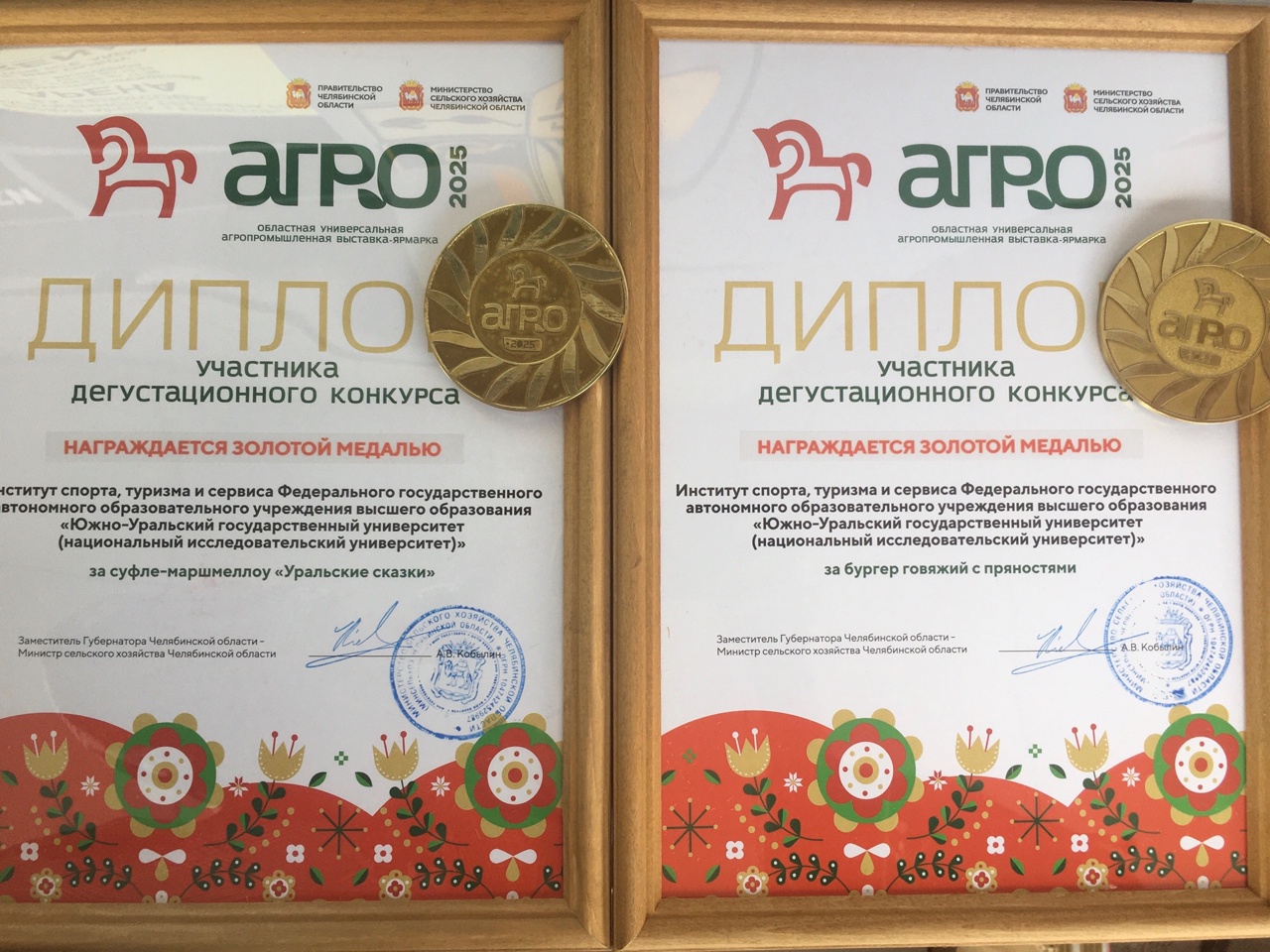Кафедра «Технология и организация общественного питания» Института спорта туризма и сервиса ЮУрГУ завоевала две золотых медали в Дегустационном конкурсе в рамках XXXI Областной универсальной агропромышленной выставки-ярмарки «АГРО-2025», организованной Правительством Челябинской области и Министерством сельского хозяйства Челябинской области.
